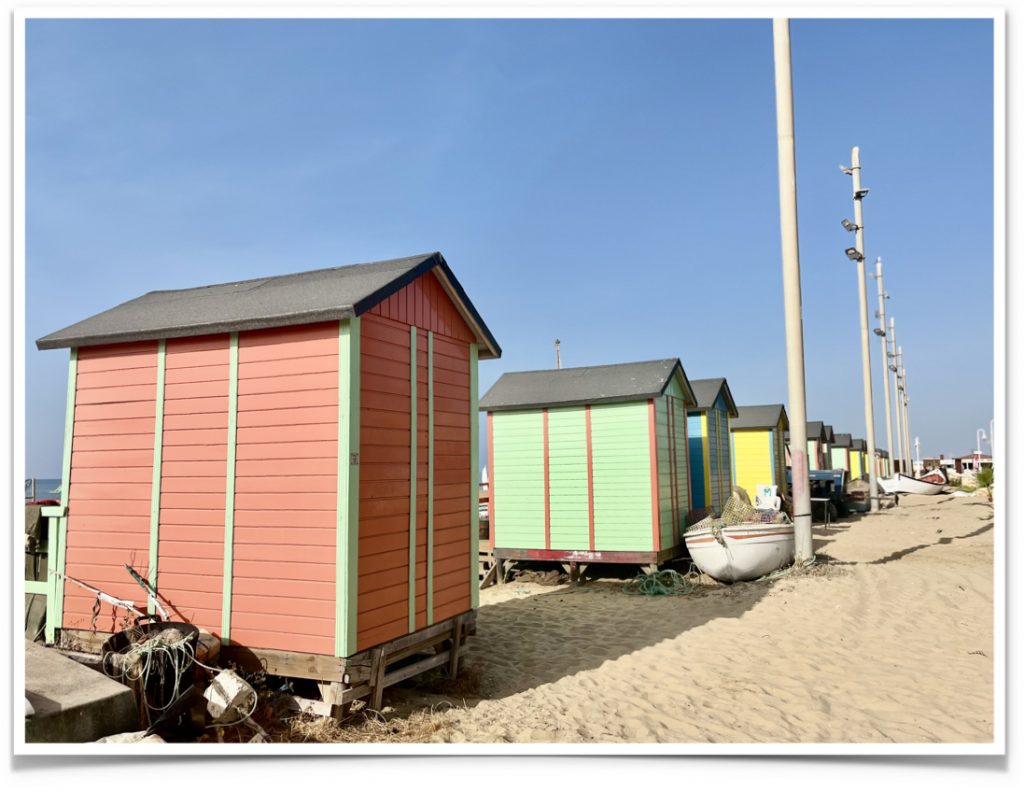 Entre la playa y el paseo, las casetas de colores en las que los pescadores guardan sus herramientas y labores de pesca, nos distraen un poco del hecho de que estamos pasando por una zona de trabajo. Pero junto a las coloridas casetas, barquitas, redes, jaulas y tractores nos recuerdan que eso es lo es. Los pescadores están ahora en la playa, recogiendo o reparando sus redes.